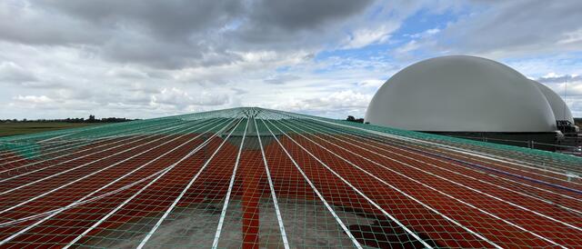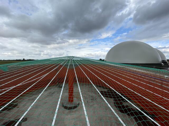 The substructure is used for mounting the double membrane and it prevents the double membrane from becoming immersed in the substrate when the gas pressure drops for operational reasons. The substructure consists of a polyester strap layer fastened at the centre of the tank to the crown ring and to the upper tank edge. For concrete tanks, the fastening at the upper tank edge involves flaps on the lower clamping profiles, whereas for steel tanks it involves strap mounting brackets fastened to the tank wall. All metallic components are made of corrosion-resistant stainless steel.